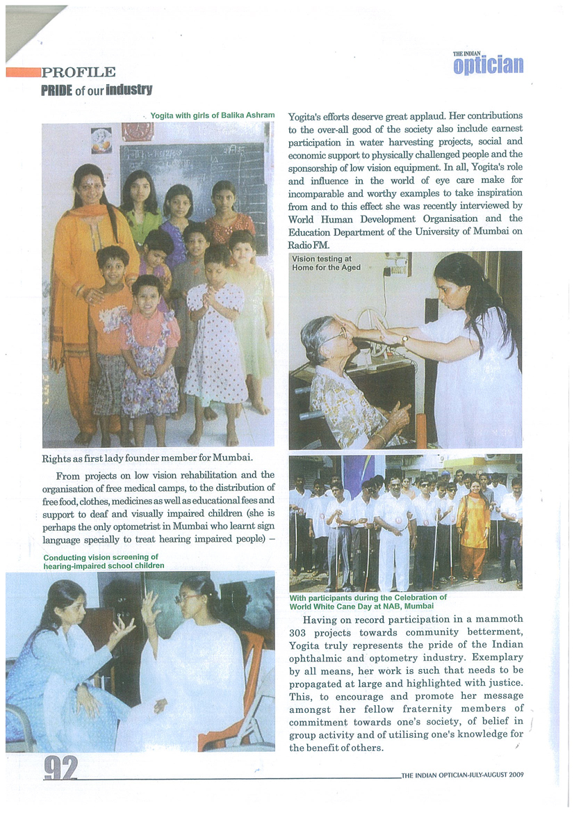 33. Received award for the Best optometrist of Mumbai for the school screening programmed for refractive error project called Vision-2001 on 19th February 2002 by Giants International Federation 1A